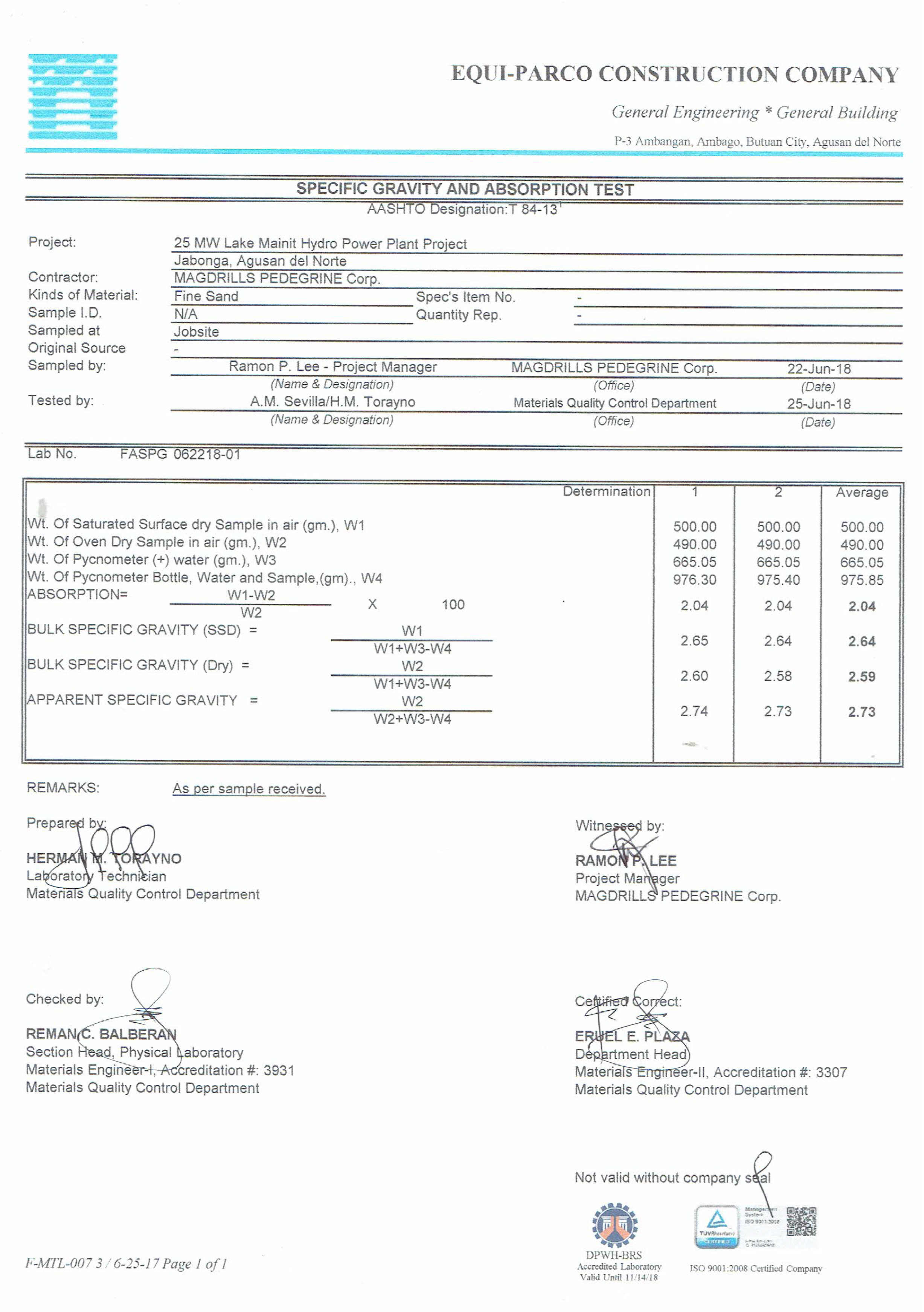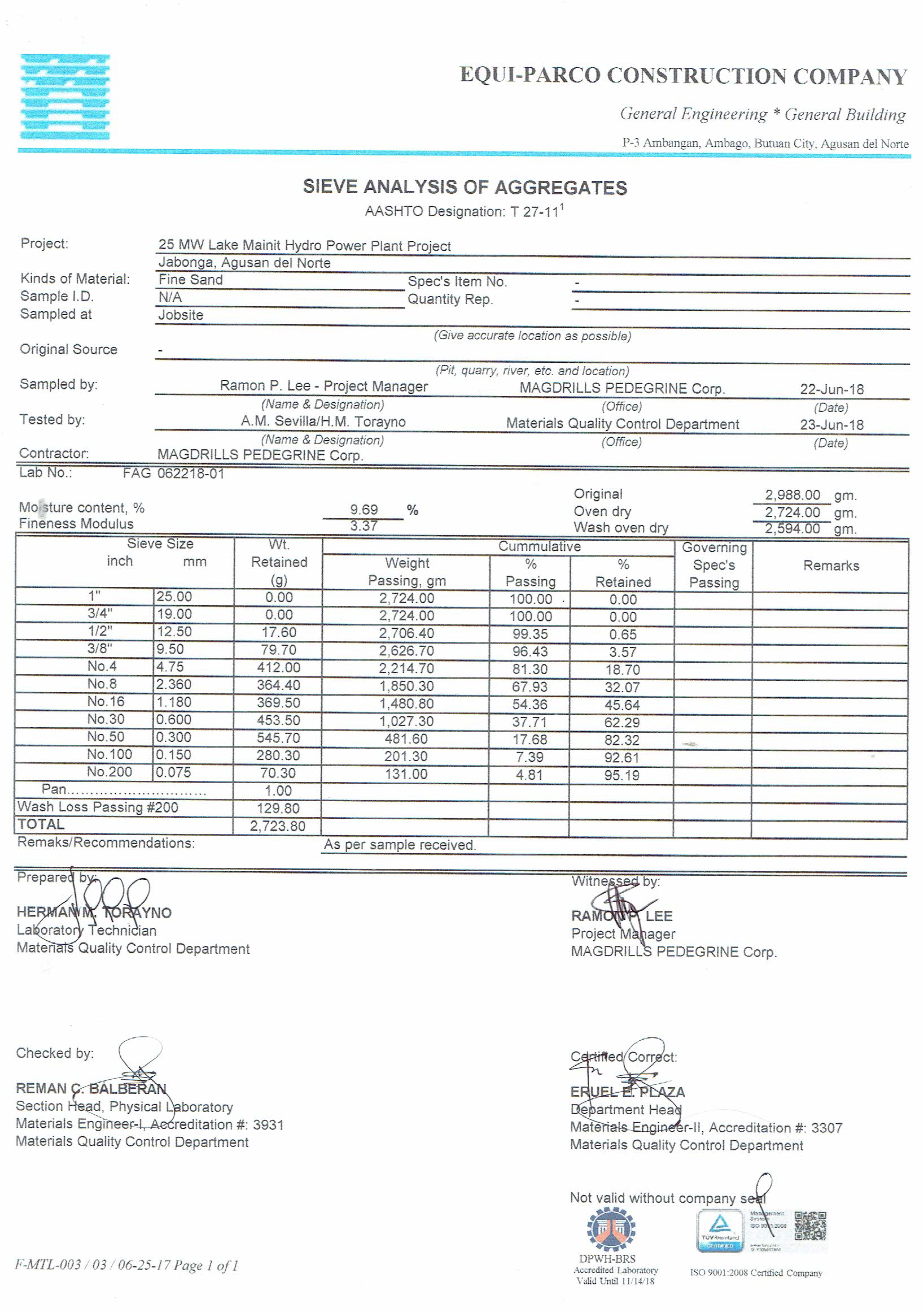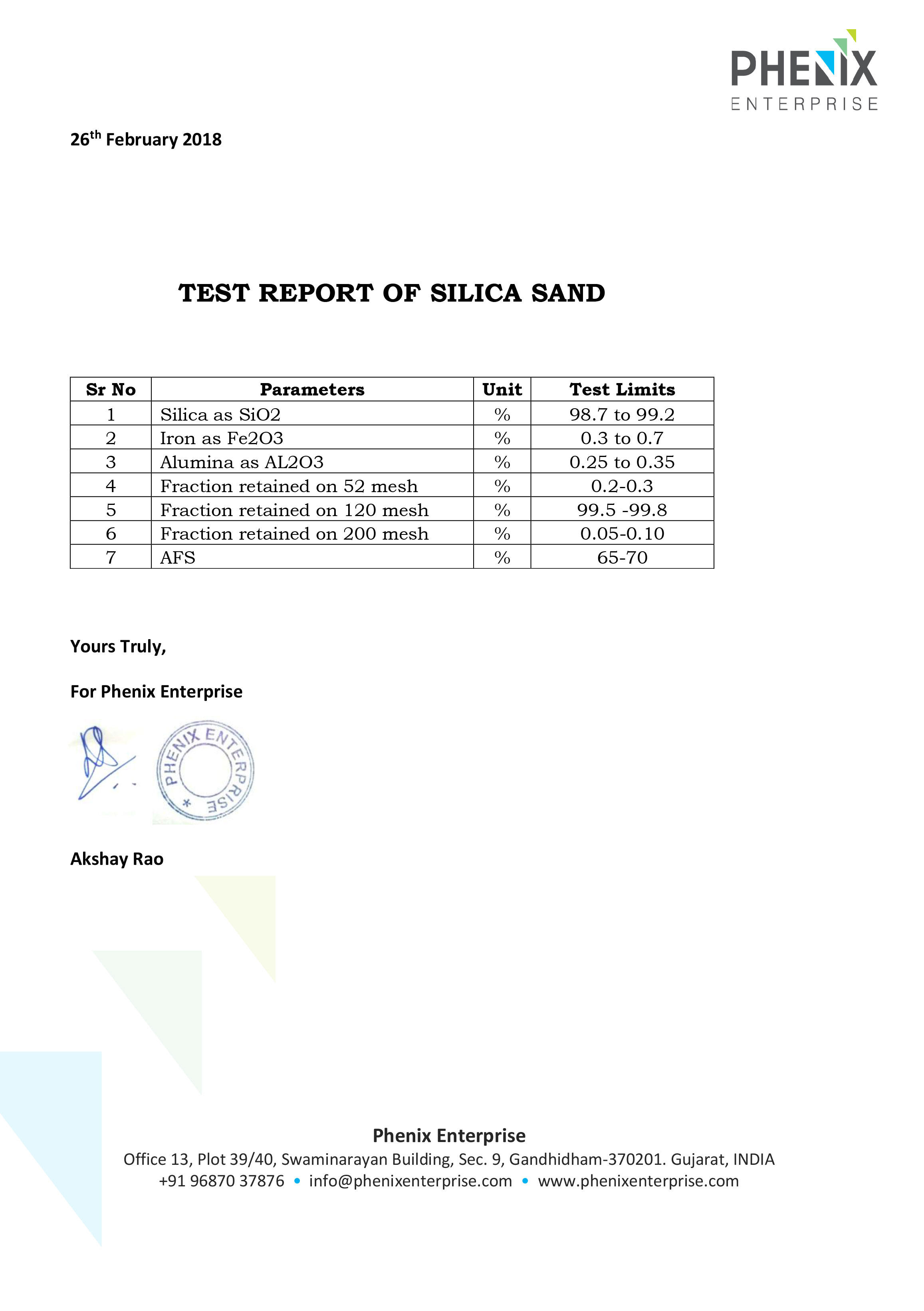 The following are the laboratory results of Fine Sand, seven (7) results for variety of test samples.