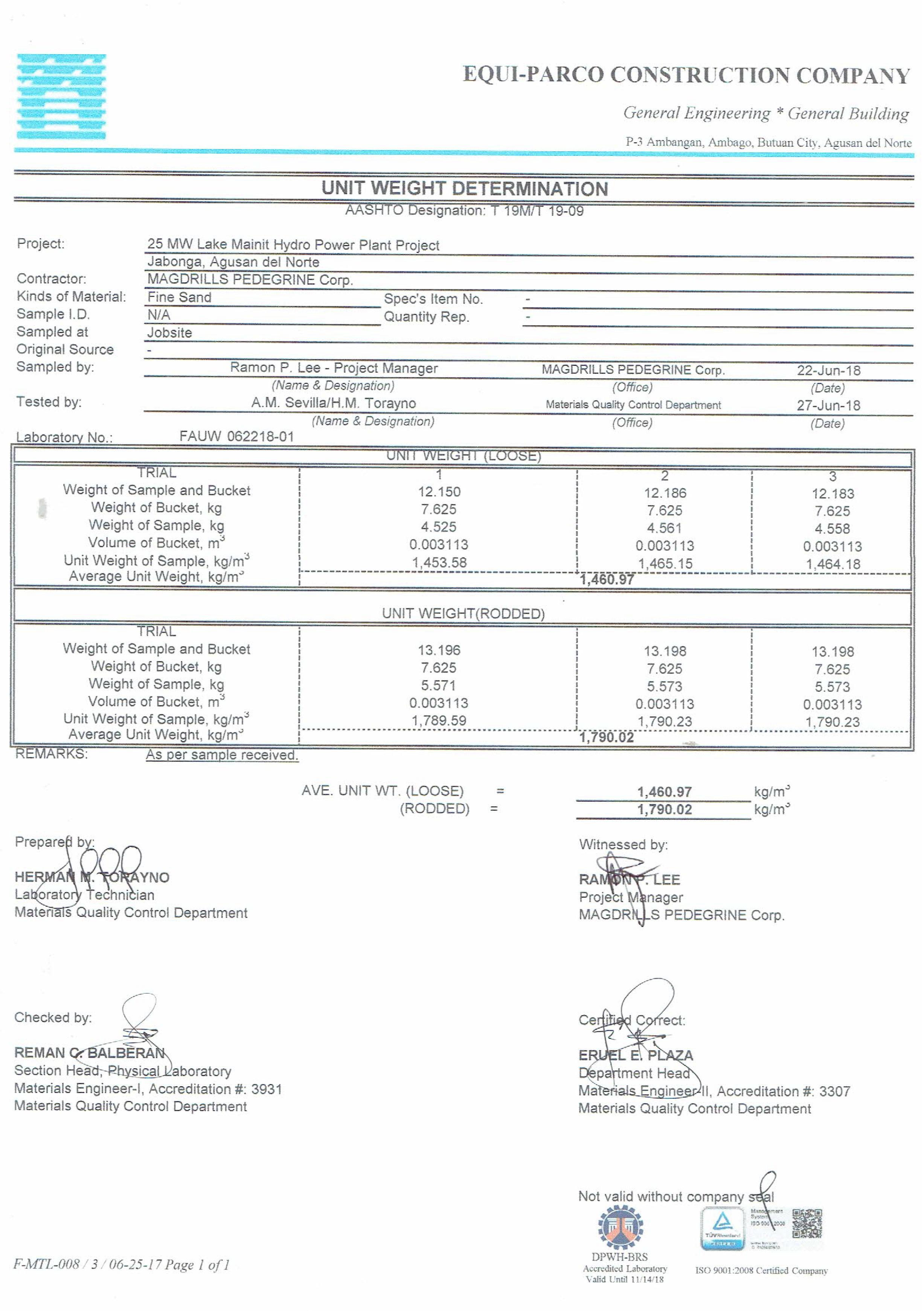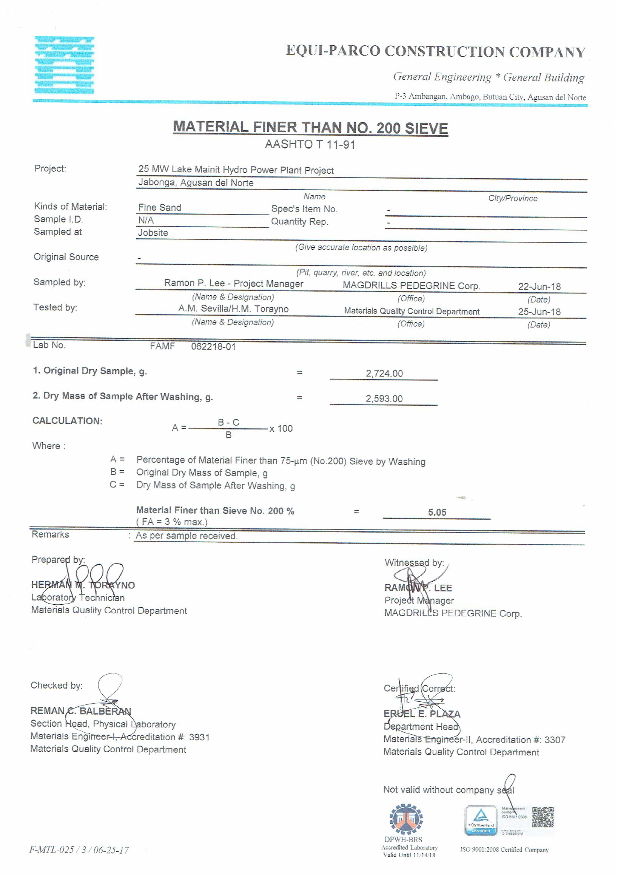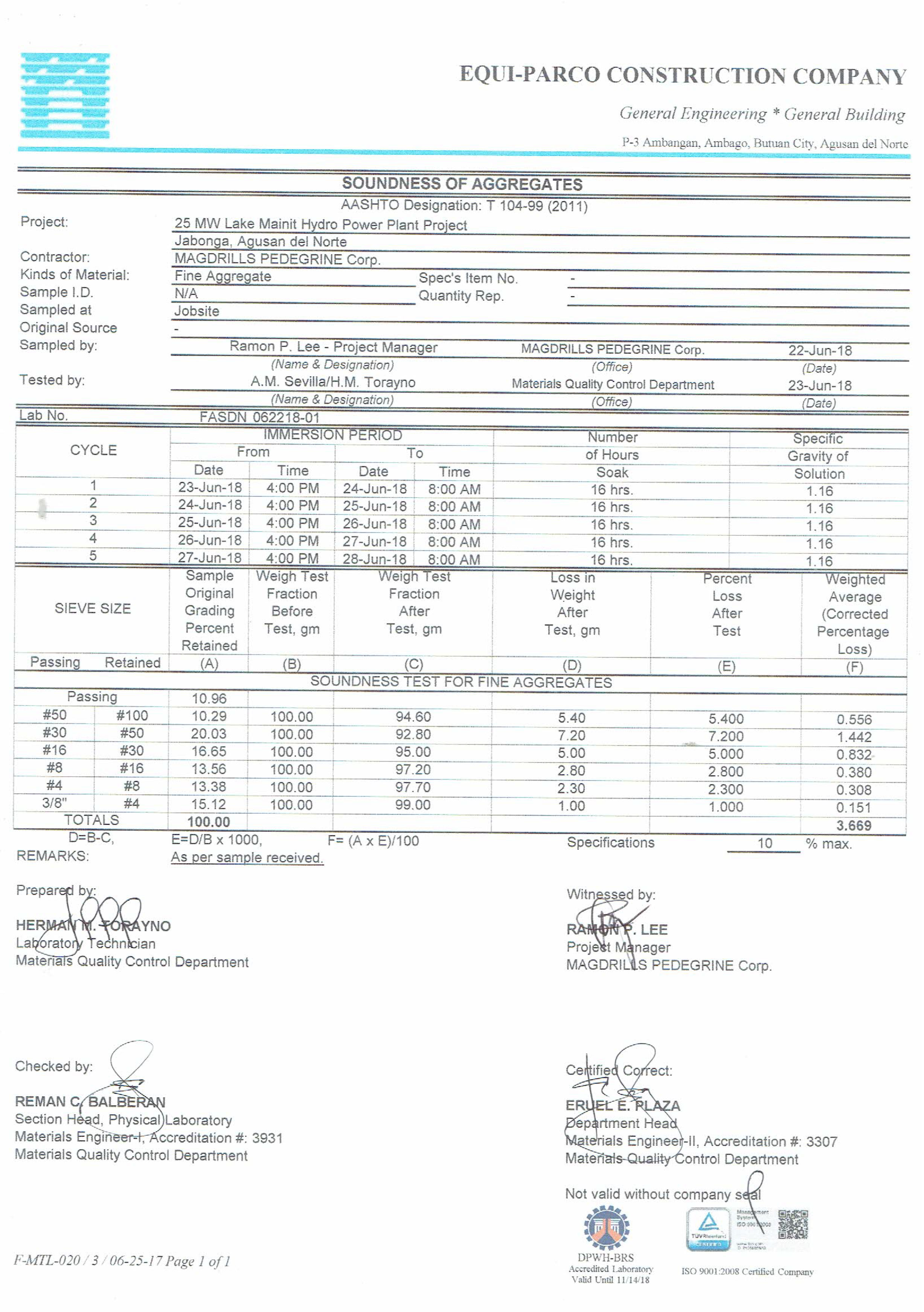 The following are the laboratory results of Fine Sand, seven (7) results for variety of test samples.